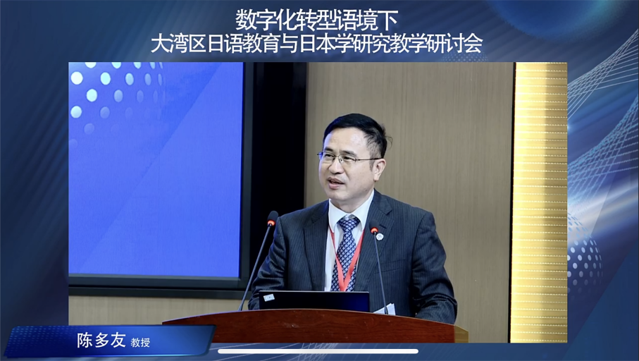 主旨报告环节,伟德bv国际体育共有两位专家受邀发言。首先,陈多友教授作了题为“数字化时代我国日语教育改革与发展”的主旨报告,详细阐述了数字化技术给日语教育带来的挑战和机遇。