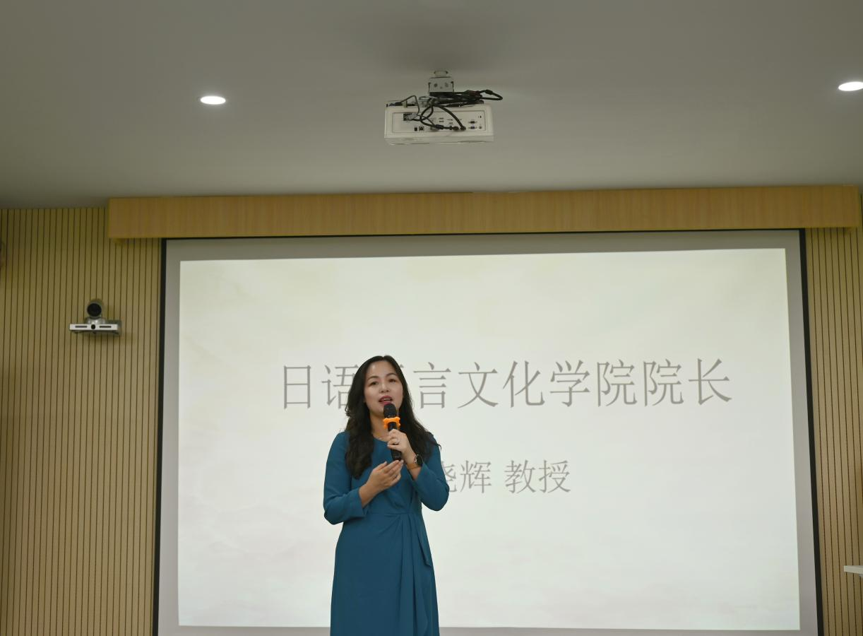 杨晓辉教授则围绕“祝贺”、“欢迎”、“回顾”、“展望”这四个主题进行了发言。她首先对今年9月份新加入亚洲校园的2023级广外学子表示衷心祝贺,其次对来自韩国东西大学和日本立命馆大学的留学生的到来表示热烈欢迎。接着,她回顾了我校亚洲校园计划创办的辉煌历史,并对一直以来为亚洲校园的建设默默付出的全体同仁表示感谢。最后她对亚洲校园的学子们提出了期待,希望亚洲校园学子要肩负东亚人文交流使者的责任与义务,为中日韩三国的友好往来作出贡献。
