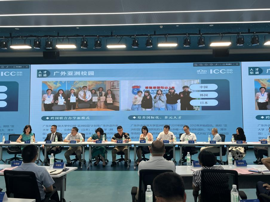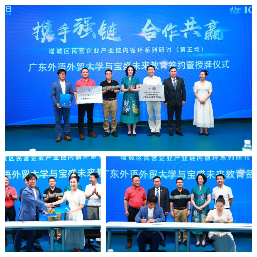 为全面深化校企合作,实现产学融合、共谋发展的良好局面,2023年9月21日下午,“增城区民营企业产业链内循环系列研讨(第五场)科技创新、产教融合及人才引进产业专题‘伙伴日’”在增城创新开发区举行,应广州宝盛国际ICC创新中心陈伟董事长邀请,日语语言文化学院名誉院长陈多友教授、中日韩亚洲校园教育中心教育总监全优教授、翻译系系主任全明博士一行出席了本次活动。其间,与东道主及一同与会的企业界间开展了深入的交流与探讨,现场签订“产教融合实践教学基地”协议,并举行了授牌仪式。