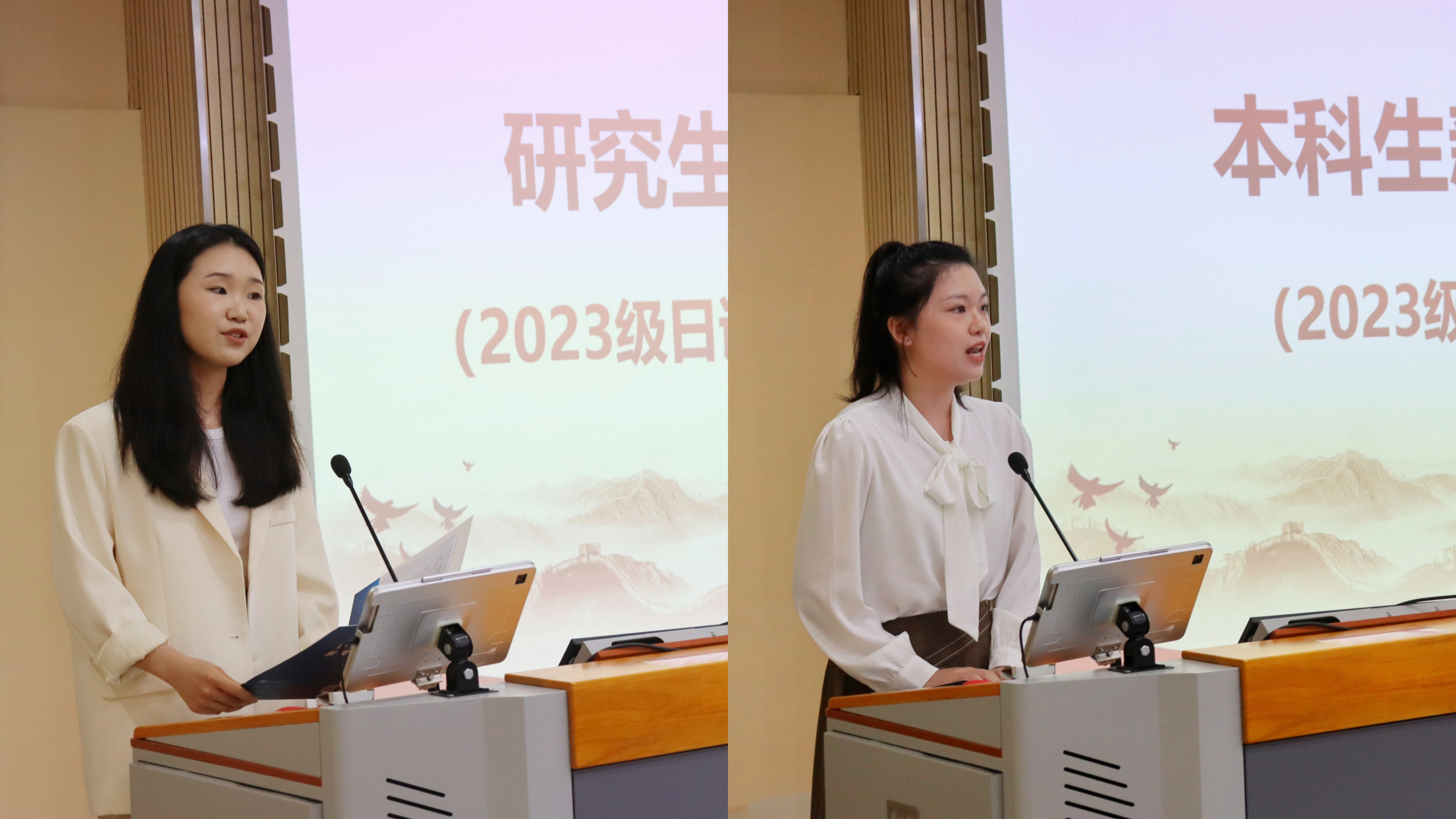 研究生新生代表朱媛媛(左)/本科新生代表曾欣然(右)发言