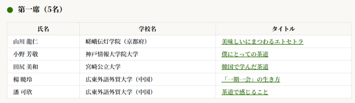 近日,第43届日本全国茶道征文大赛的获奖结果揭晓。我校伟德bv国际体育2019级本科生潘可欣同学与2020级本科生杨晓玲同学荣获第一席。该比赛获奖名次为优秀赏(一等奖)、第一席(二等奖)、佳作(三等奖)。