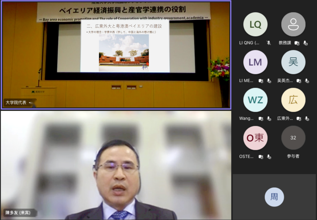 陈多友教授线上参会并发表题为《中国粤港澳大湾区人才培养与产官学合作实践》的演讲。在演讲中,陈多友教授对粤港澳大湾区的综合优势、人才培养、大学建设等问题作出分析,并着重就我校国际化人才的培养与实践进行了介绍。陈多友教授指出,多年来,我校坚持文理融合、文文融合,为粤港澳大湾区建设培养了一大批具有家国情怀、国际视野、创新能力的高素质复合型国际化人才。截至目前,我校与60多个国家和地区的486所大学及学术文化机构建立了合作交流关系。其中,“亚洲校园”计划是由我校与韩国东西大学、日本立命馆大学共同运营的,由双边向多边发展的跨国联合办学新模式,立足东亚,面向世界,表现亮眼。