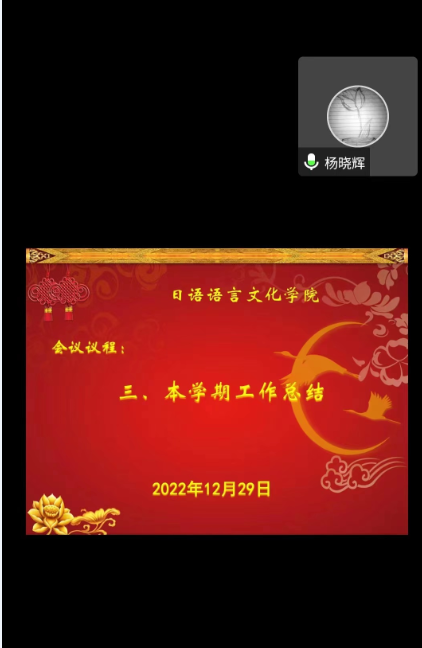 学院全体院领导分别就分管工作进行总结汇报。一年来,学院党委结合专项督查,压实管党治党责任。针对反馈意见,深入落实整改要求,推进制定或修订了一系列制度,建立长效机制,巩固整改成果。学院以党建引领内部治理、疫情防控、教学科研等重大工作开展,推进中层干部换届工作,完成支部换届选举。学院全面推进专业和学科内涵建设,获评学校“三全育人”建设试点建设单位;日语专业虚拟教研室获批教育部立项,日语专业第二学士学位首次开展招生和培养;教师获得国家社科项目2项、在CSSCI来源期刊发表论文8篇、出版多部学术译著专著等,荣获首届“外研社杯”全国高校日语专业课程思政教学设计大赛一等奖;师生团队助力“读懂广州”东京推介活动,用日语讲好中国故事。日语学子入围“2021年广东大学生年度人物”,在“永旺杯”全国口译大赛、第五届“人民中国杯”日语国际翻译大赛等专业赛事中喜获佳绩。