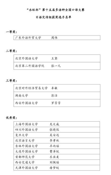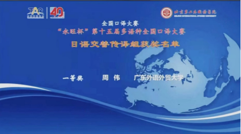 “永旺杯”多语种全国口译大赛是国内外参赛选手最多、语种最多、规模及影响最大、赛事水平最高的权威性多语种口译赛事;本届口译大赛是庆祝中国翻译协会成立四十周年系列活动之一。伟德bv国际体育2021级日语翻译硕士周伟和俞莹同学分别参加了日语交替传译和日语同声传译的比赛。 经过初赛的选拔,最终有来自广外、北外、上外等20所高校的27名选手进入到日语组的复赛。比赛过程紧张激烈,选手们需要在规定的时间内发挥日语水平、展示口译技能。两位同学的优异表现充分展示出伟德bv国际体育在日语翻译人才培养方面的不俗实力。