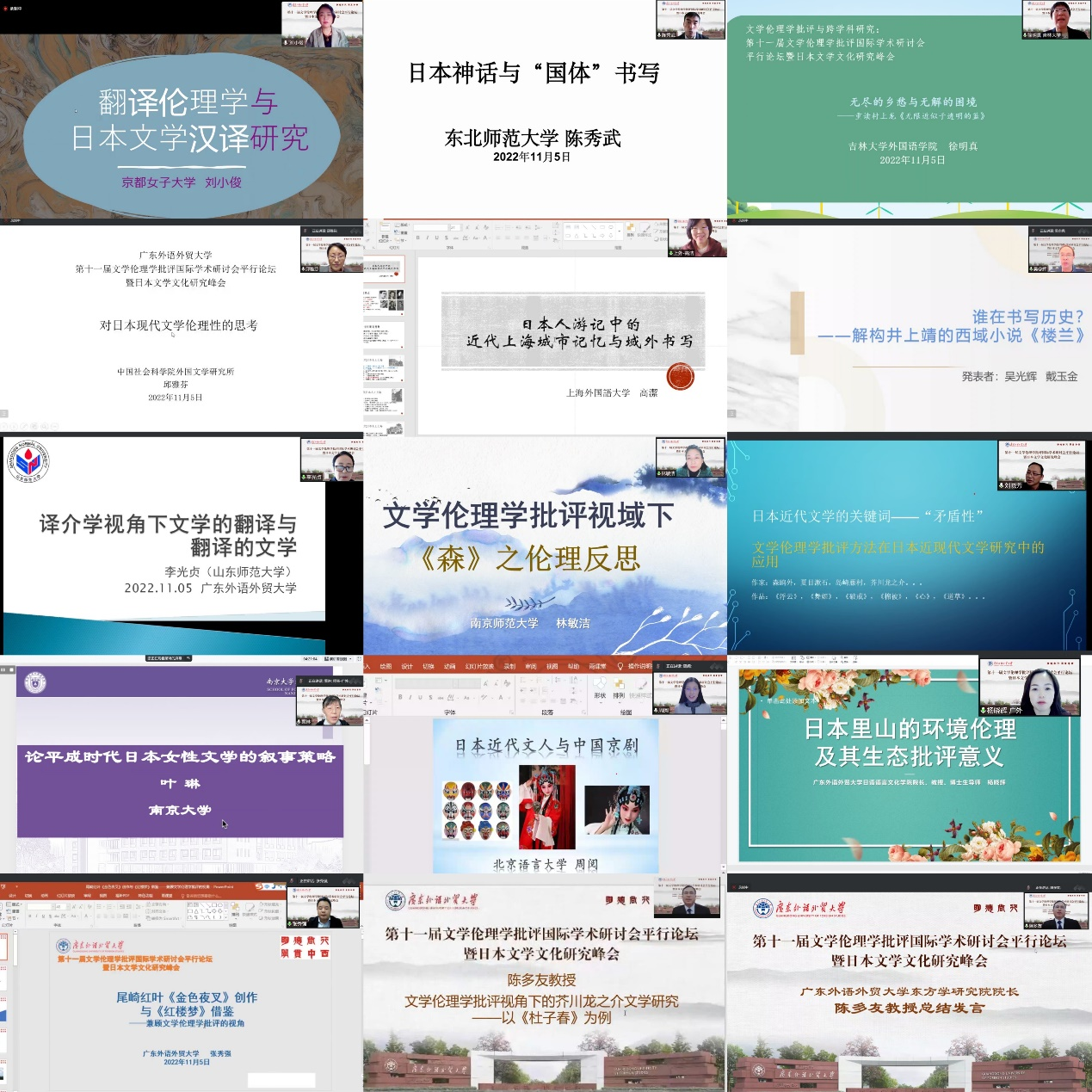 2022年11月5日,第十一届文学伦理学批评国际学术研讨会平行论坛暨日本文学文化研究峰会顺利召开。此次会议由伟德bv国际体育,BETVICTOR官网主办,东方学研究院、日语语言文化学院、中日比较生态文学研究所、教育部日语专业虚拟教研室、中国日语教学研究会华南分会承办。来自中国社会科学院、东北师范大学、京都女子大学、上海外国语大学、山东师范大学、南京师范大学、同济大学、厦门大学、南京大学、北京语言大学、吉林大学及伟德bv国际体育,BETVICTOR官网等国内外高校、科研院所的14名专家、学者在会议中进行专题报告,12名青年学者在青年学者圆桌论坛中对自己的研究课题进行汇报。会议由伟德bv国际体育,BETVICTOR官网日语语言文化学院副院长张志刚教授、日本社会文化系主任程亮副教授主持,共吸引超过20所院校、近300名专家学者参与。