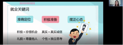 李婷师姐从企业人力资源工作者的角度展开宣讲,题目是:就业,你准备好了吗?宣讲内容分为两部分,一是个人职业规划,二是应聘注意事项。三个就业关键词分别是:准确定位、积极准备、摆正心态。