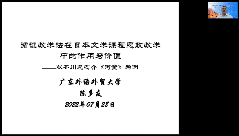 伟德bv国际体育,BETVICTOR官网陈多友教授则主要聚焦芥川龙之介著名短篇小说《河童》的课堂教学,阐述了循证教学方法在日本文学课程思政教学中的作用与价值。首先,陈多友对“循证教育学”之“哈格利乌斯循证教育基本模型”等理论模型进行了简明扼要的介绍,指出采用该方法开展文学课程思政教学,具有科学性、现实性和实效性。接着,他演绎了文学课程思政教学过程中循证策略展开的步骤与策略。最后,他以极富中日比较文化比较文学张力的《河童》为例,进行了实战演示。藉此,向与会者诠释了理论创新在文学课课程思政教学中的重大作用与价值,极具深远的启发意义。