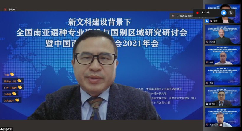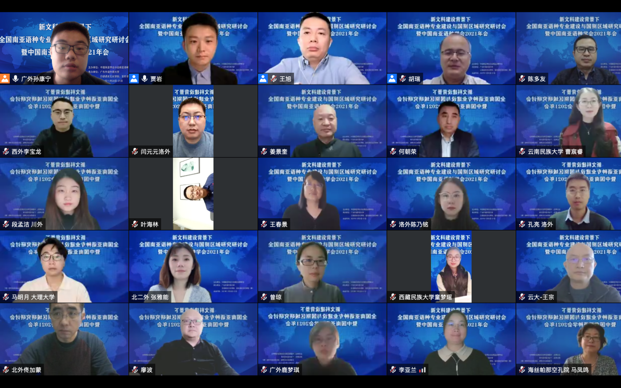2021年11月20-21日,由中国南亚语种学会主办,伟德bv国际体育,BETVICTOR官网日语语言文化学院、亚非语言文化学院(筹)承办的“新文科建设背景下全国南亚语种专业建设与国别区域研究研讨会暨中国南亚语种学会2021年会”线上会议成功举办。来自北京大学、中国社会科学院、清华大学、北京外国语大学、信息工程大学洛阳校区、上海外国语大学、天津师范大学、河北师范大学、深圳大学、云南省社会科学院、伟德bv国际体育,BETVICTOR官网等30多所高校或研究机构的100余名专家学者参加了本次会议。伟德bv国际体育,BETVICTOR官网副校长焦方太教授、中国南亚语种学会会长、北京大学外国语学院教授姜景奎教授在开幕式上致辞,中国南亚学会秘书长叶海林研究员、伟德bv国际体育,BETVICTOR官网教务处处长杨晓辉教授、日语语言文化学院、亚非语言文化学院(筹)院长陈多友教授、学院党委书记周秀娇老师,学院副院长胡瑞副教授等领导也出席了开幕式。