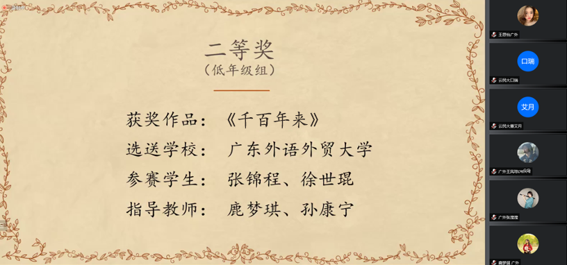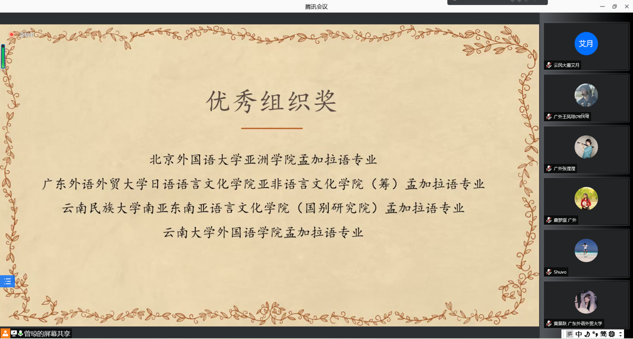 中国南亚语种学会会长、北京大学南亚研究中心主任姜景奎教授出席了线上颁奖仪式并致辞。姜景奎教授对孟加拉语学子提出了殷切期望,希望各高校孟加拉语学子能充分运用所学语言,讲好中国故事。来自各高校的师生代表进行了发言,指导教师谢淼老师在发言中提到,在练习过程中学生遇到了音色与作品角色不符的困难,虽然不能完美还原作品,但通过增加练习频率和投入感情可以更加贴近作品。学生代表朱美澄表示,通过此次比赛,她和同学们学习孟加拉语的兴趣得到了极大提升,对于孟加拉国文化有了更大的兴趣,也增加与其它高校师生的交流。