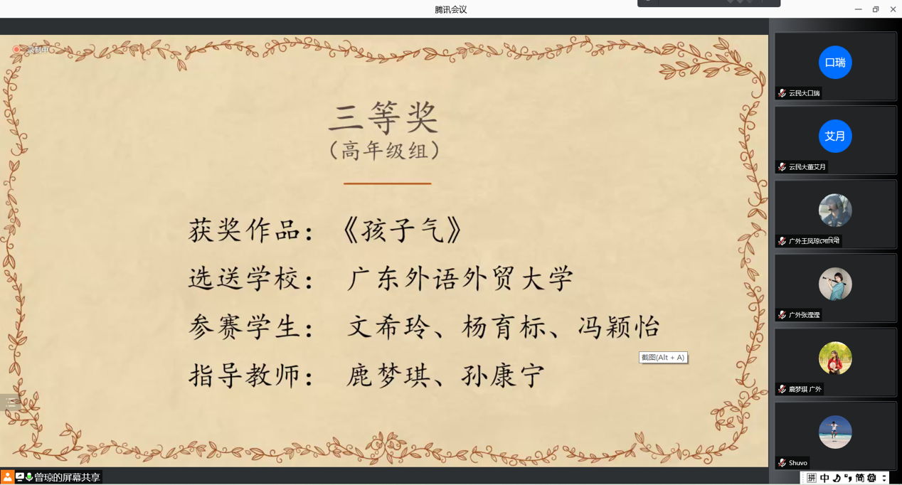 文希玲、杨育标、冯颖怡凭借《孩子气》配音片段斩获高年级组三等奖