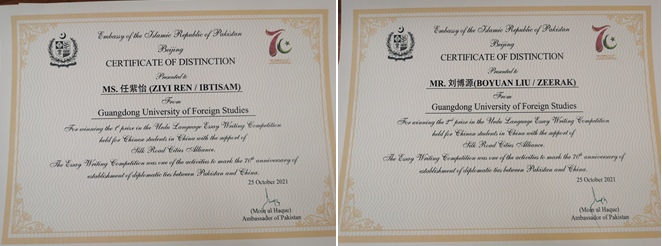 根据大赛结果,伟德bv国际体育乌尔都语专业2019级学生任紫怡获得一等奖,2018级学生刘博源获得二等奖。在本次征文大赛中,乌尔都语专业的学生参与热情高涨。通过参加本次比赛,学生们不仅锻炼了外语写作能力,还借此加深了对中巴友谊的认识与理解。同时学生们在比赛中展现出优秀的语言水平,受到主办方的认可与赞赏。