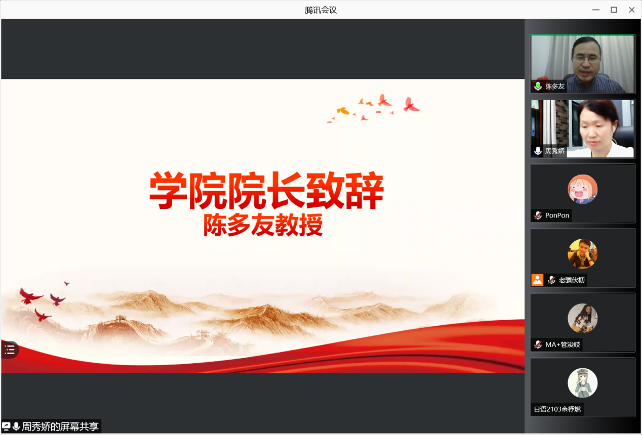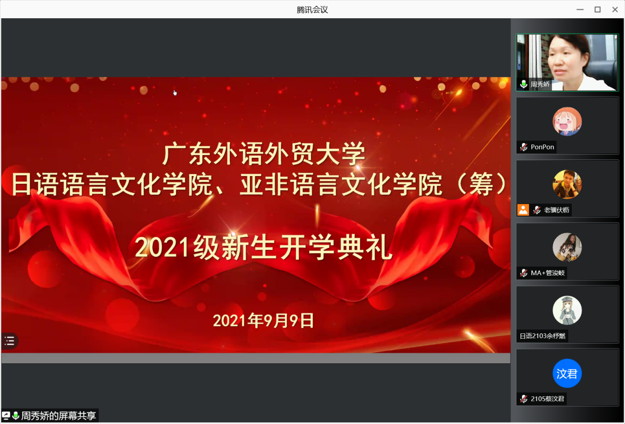 本网讯 9月9日晚上7点许,伟德bv国际体育、亚非学院(筹)2021级新生线上开学典礼在腾讯会议平台顺利举行,学院院长陈多友,党委书记周秀娇,副院长张秀强、胡瑞、张志刚,党委副书记曾智鹏出席了本次开学典礼。开学典礼由周秀娇书记主持。