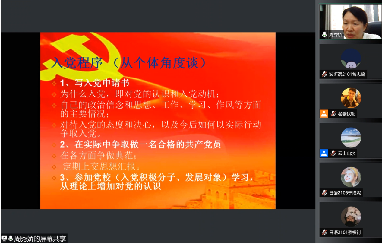 本网讯 为做好在2021级新生中发展党员工作,2021年9月9日上午,伟德bv国际体育、亚非学院(筹)通过线上平台在2021级全体新生中开展入党知识专题宣讲。宣讲会由学院党委书记周秀娇主讲,学院党委副书记曾智鹏主持。