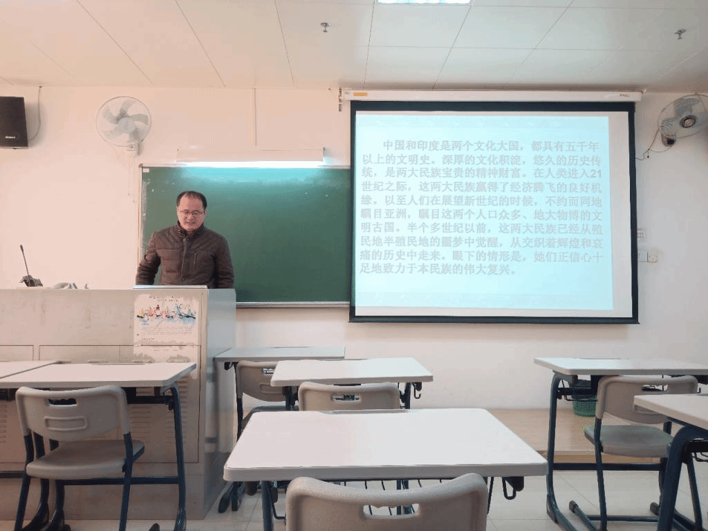 在本次教学实践周活动中,胡瑞老师在讲座中以时下时政热点中印边境冲突造成中印两国死伤的事件为例,重点讲述了当今中印边境冲突下的中印关系特点以及形成原因,分析了印度民族的国民性和宗教文化等各方面的诱因。
