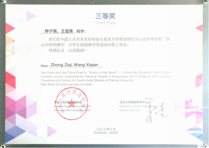 本网讯 10月10日,由北京大学南亚研究中心和中国人民对外友好协会联合举办的“柯棣华诞辰110周年纪念活动”成功在线举行。其间举行了“我心中的柯棣华”中印大学生短视频征集活动颁奖仪式,伟德bv国际体育,BETVICTOR官网印地语专业王玺茜、钟子琪同学的作品“柯棣华科普小课堂”荣获三等奖。