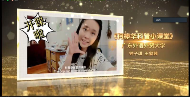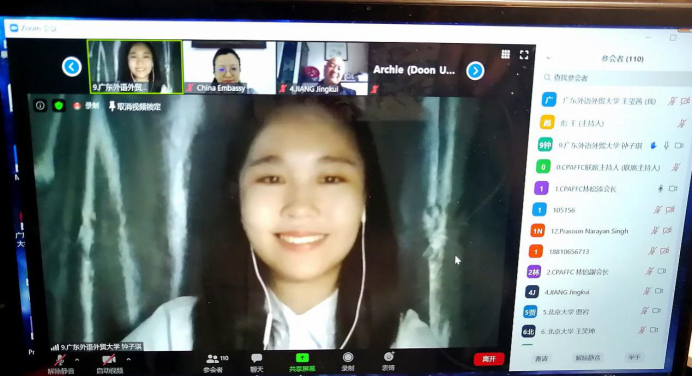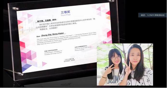 颁奖仪式后,林松添会长、姜景奎教授及中印双方教师和学生代表分别讲话。在发言分享环节中,我校钟子琪同学分享了自己视频制作的心得、对柯棣华精神的理解以及表示了对中印友好的期盼。