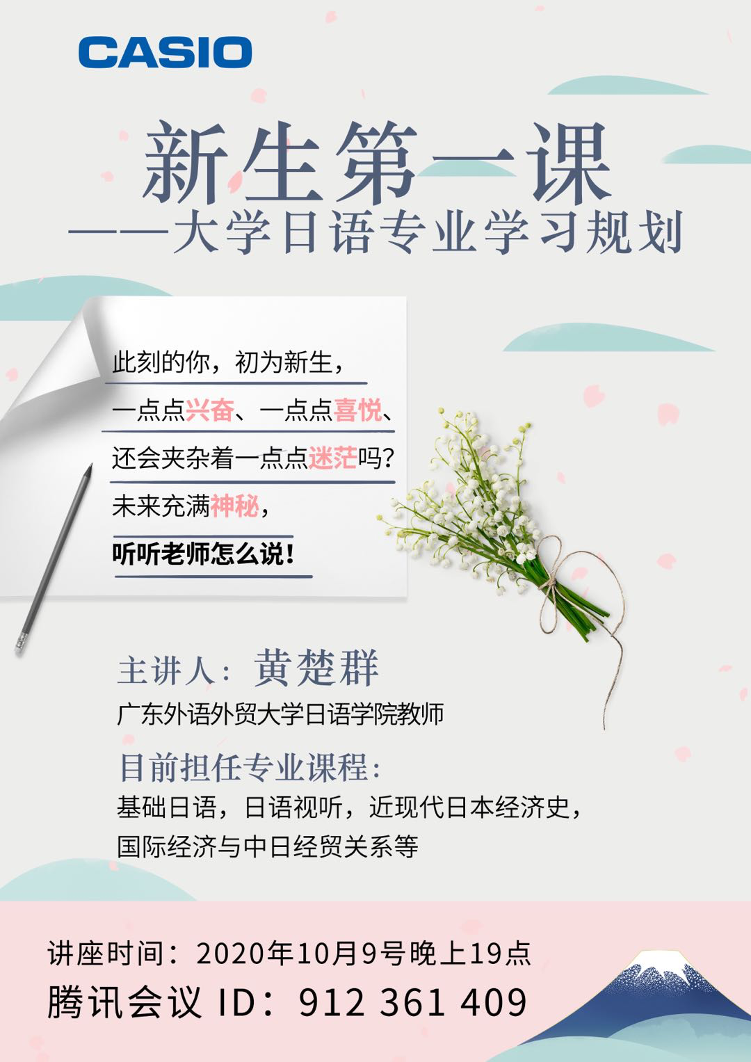 10月9日下午,日本社会文化系教师黄楚群以“新生第一课”为题,向2020级日语专业新生分享了日语学习方法及大学学习规划的制定方法。黄楚群先向同学们介绍了广外日语专业的课程设置,让同学们能够了解学院为大家提供的课程规划,希望同学们能够配合课程规划,在大一大二阶段打好语言基础。此外,还强调了大学学习中最关键的是要有学习自主性,建议同学们在反复试错过程中,找到自己的目标,根据自身情况制定好学习规划。