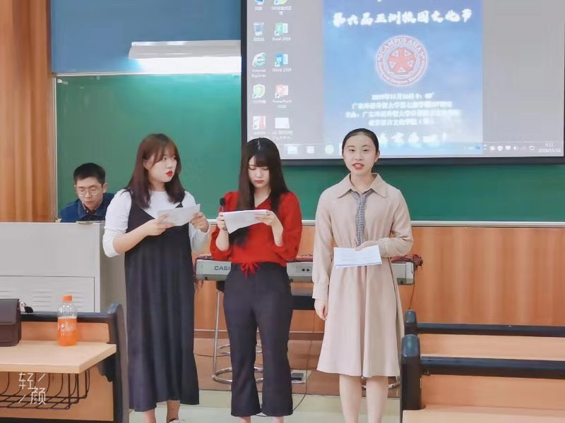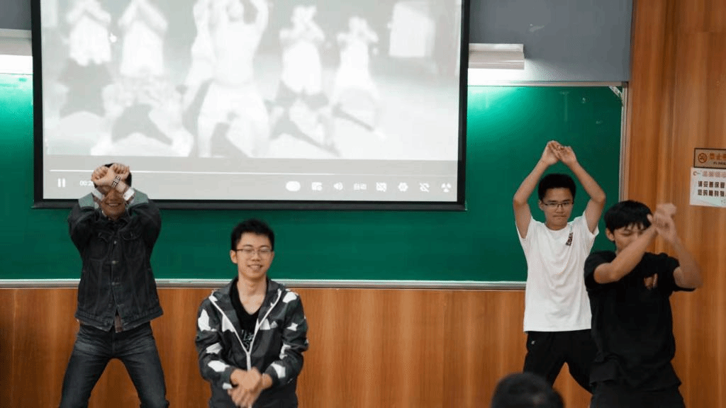 现场还准备了有趣的游戏环节。在听歌识曲的环节中,主持人分别播放了中、日、韩三国的歌曲。在一阵阵熟悉的音乐响起后,同学们踊跃回答,热情高涨,欢呼声此起彼伏,现场气氛热烈。在你划我猜的环节中,中、日、韩三国的学生为了让同伴能够猜出指定的单词,绞尽脑汁,努力猜答。在游戏环节的最后,学生们还邀请老师们加入到游戏环节中。
