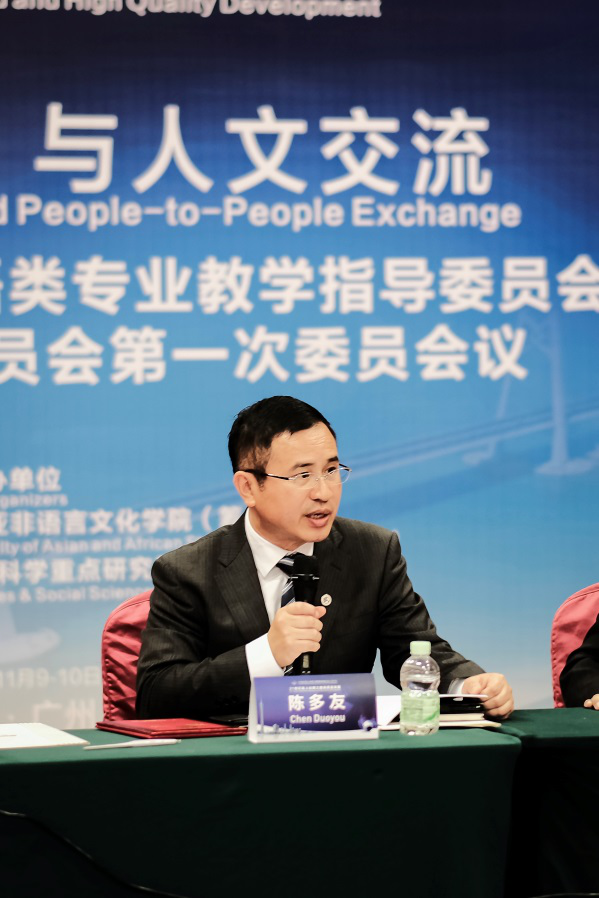 11月9日下午,广东省本科高校外语类专业教学指导委员会亚非语言专业分委员会成立大会暨第一次委员会议在广州白云国际会议中心3号楼C405成功举办。新一届亚非语言专业分委会共有成员17名,含主任委员1名,副主任委员2名,委员12名,行业专家1名,秘书长1名。伟德bv国际体育,BETVICTOR官网日语语言文化学院•亚非语言文化学院(筹)院长陈多友教授担任新一届教指委主任委员。