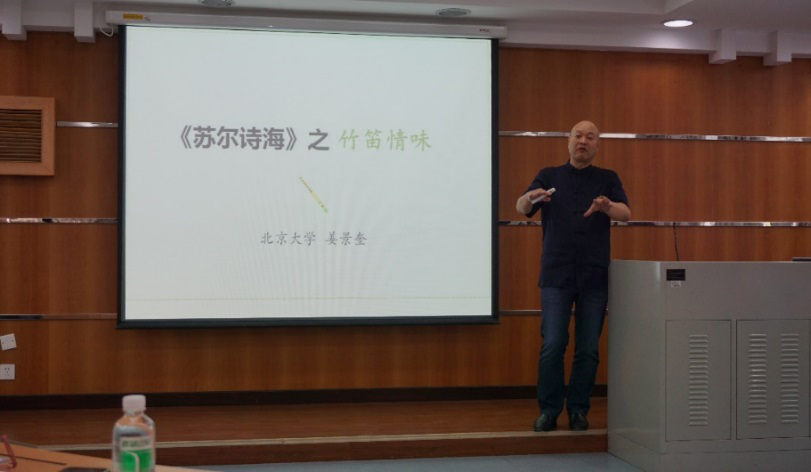 聘书颁发仪式后,姜景奎教授主讲了题为“苏尔诗海之竹笛琴味”的讲座。姜景奎教授选取该诗歌集中与竹笛相关的诗歌,基于翻译研究,赏析苏尔达斯的竹笛情味。讲座幽默风趣,内容引人入胜。此次讲座加深了师生们对印地语巨著《苏尔诗海》的了解,提高了学生学习语言和相关文学知识的兴趣。来自伟德bv国际体育印地语、乌尔都语、孟加拉语等多个专业的师生认真聆听了本次讲座。