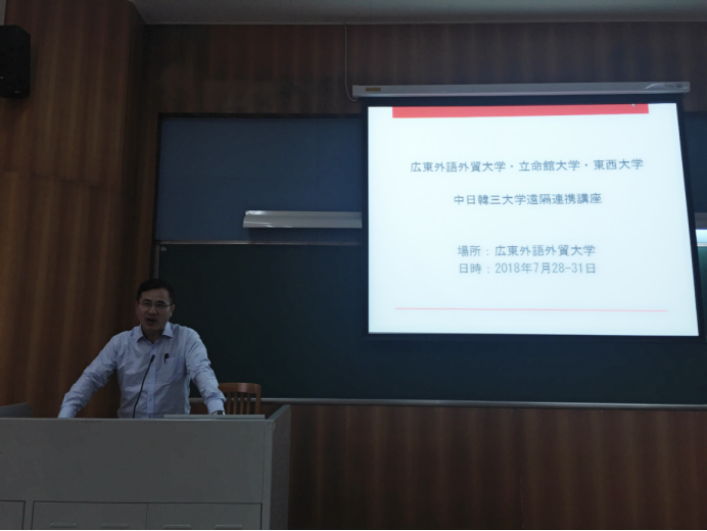 日语语言文化学院在7教107室为中日韩三国本硕博学生安排了讲座。院长陈多友教授代表学院致辞,对日韩师生的到来表示欢迎,希望能通过面对面集中授课和现场文化体验,让大家学习到有别于远程课堂上的教学内容。带队教师代表韩国东西大学亚洲校园中心主任(东亚学科系主任)诸点淑、日本立命馆大学大田壮一郎分别表达了对此次活动的期待。