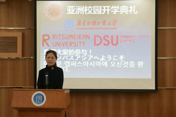 随后,李利群处长致辞,她表示,在教育部对所有亚洲校园的中期评估中,广外的亚洲校园项目从目标设定、教学活动、质量保障、学习成果等方面均获得评估专家的最高评价。此次专程来广外参加此次活动,也是希望能更多了解广外亚洲校园的人才培养模式,以期在全国推广和复制。她还对从5000名新生中经过严格遴选进入亚洲校园项目的18级新生能够成为中日韩三国交流的使者表示由衷的祝贺。