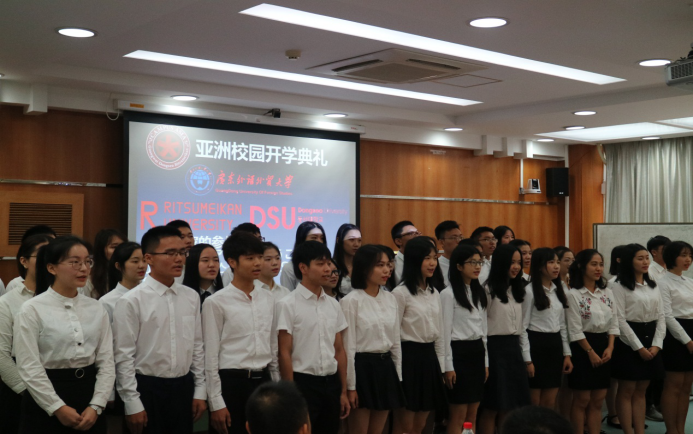 开学典礼在亚洲校园17级、18级学生及日本立命馆大学、韩国东西大学二、三年级留学生的合唱声中拉开序幕。学生们深情地用中日韩三语合唱了亚校歌曲《教师是灯塔》,向老师们表达了感恩之情。