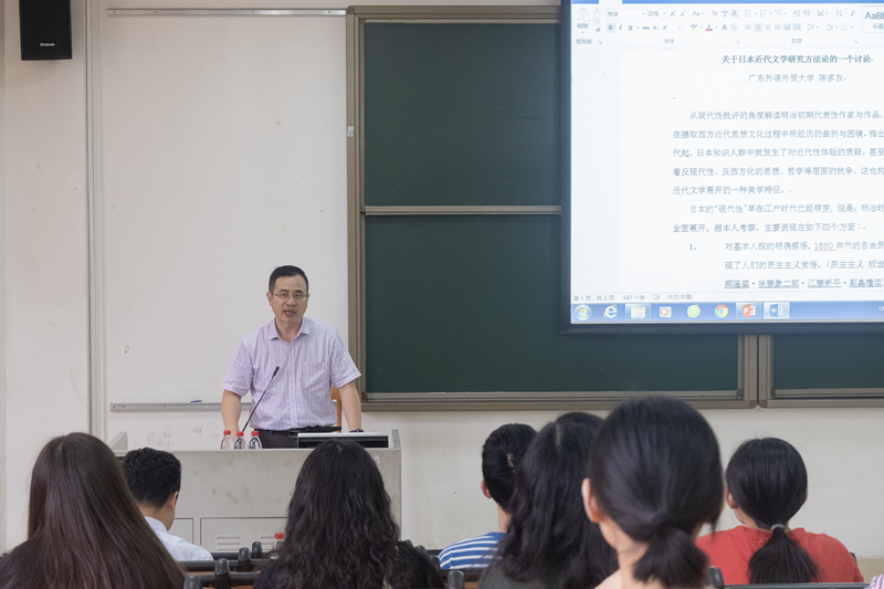 首先,陈多友院长就“关于日本近代文学研究方法论的一个讨论”这一主题,从现代性批评的角度解读明治初期代表性作家与作品,分析日本在摄取西方近代思想文化过程中所经历的曲折与困境,指出自明治时代起,日本知识人群中就发生了对近代性体验的质疑,甚至长期存在着反现代性、反西方化的思想、哲学等层面的抗争,这也构成了日本近代文学展开的一种美学特征。讲座中,陈多友教授指出,日本的“现代性”早在江户时代就已经萌芽,明治时代才真正全面展开,主要从四个方面做了全面的诠释:对基本人权的明确感悟;自我意识、个人主义的觉醒;资本主义各要素发生效用;民族、国民觉悟快速强化,以至于覆盖了社会整体。讲座将高屋建瓴的学术知识融入到了大量的实例中,内容张弛有度,引人入胜,引起了在座师生的共鸣。