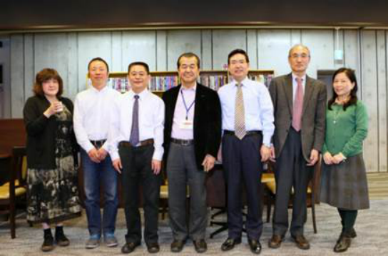 宋伍强老师和孟丁教授与札幌大学副校长兼孔子学院院长山田玲良教授(左三)及札幌大学校长助理汪志平教授(右二)等在札幌大学孔子学院办公室前合影