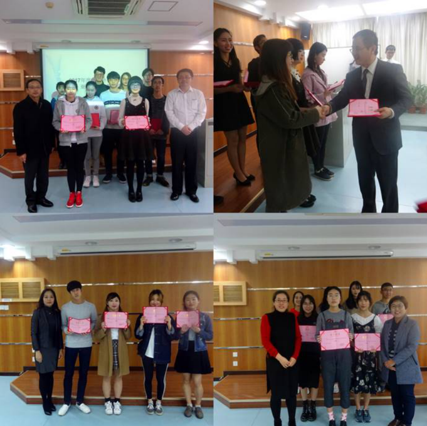 之后嘉宾刘晓芳教授、陈多友院长、杨晓辉主任、专任教师及日韩外教分别为16级、17级学生及日韩留学生等首届亚洲校园语言综合技能大赛获奖同学颁奖。