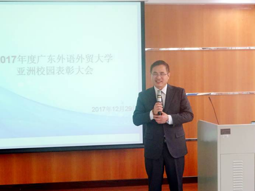 表彰大会伊始,陈多友院长致辞。陈院长首先向本次参会的嘉宾刘晓芳教授表示感谢,并向获奖的学生表示祝贺。2018年即将到来,值此之际陈院长向辛勤工作了一年的教职工们表示感谢,对学生们积极的学习态度、优秀的学习成果表示赞许。同时也向学生们表达了新一年的殷切期望,希望全体亚洲校园的学生为成为优秀的东亚地区领军人才继续努力。