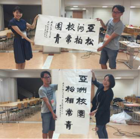 8月4日晚,立命馆大学接待方为中韩师生举行了盛大的送别会,伟德bv国际体育师生为立命馆大学和东西大学献上了写有“亚洲校园松柏长青”的字幅,受到日韩师生的交口称赞。