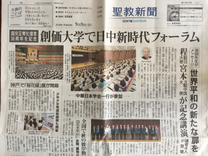 本网讯:9月8日,应日本国创价学会暨创价大学邀请,中国中华日本学会代表团一行15人访日,并出席中日邦交正常化倡言50周年纪念大会——中日新时代论坛。当日上午10时大会在创价大学本部大楼国际会议厅拉开序幕。开幕式上,代表团团长中国社会科学院日本研究所所长、全国政协委员高洪研究员,创价大学校长马场善久教授,中国社会科学院日本研究所党委书记刘玉宏研究员分别致辞。复旦大学原党委副书记王荣华教授、东日本国际大学客座研究员西园寺一晃教授、北京大学日本研究中心贾蕙萱教授以及创价大学和平问题研究所玉井秀树教授分别作基调演讲。论坛由创价大学主办,中华人民共和国驻日本国大使馆与中华日本学会为指导单位。来自中日两国高校及研究机构的150余名学者与会。