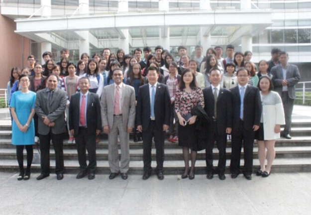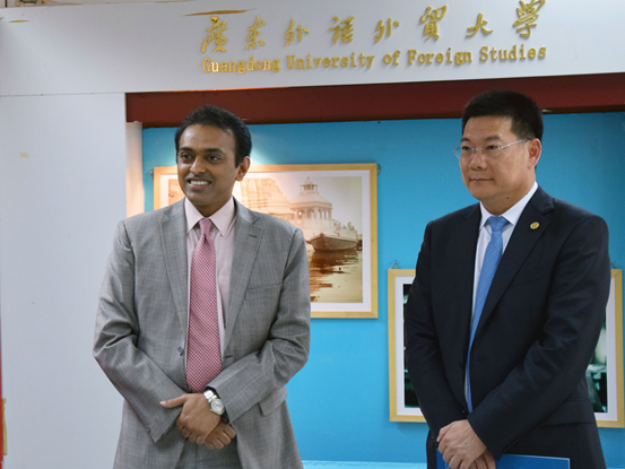 本网讯 11月20号下午,印度文化图片展开幕式在图书馆一楼通识平台举行。印度驻广州总领事馆总领事高志远(Mr.K.Nagaraj Naidu)、文化与教育领事迪拉吉·慕琦亚(Mr. Dhiraj Mukhia)、领事塔润·库玛(Mr.Tarun Kumar)一行到访我校,我校校长仲伟合亲切地会见了来宾,并共同宣布此次图片展开幕。陪同会见的有国际交流与合作处处长蔡红、副处长吴俊峰、印地语系教师胡瑞、田克萍等。印地语系全体学生出席了开幕式。