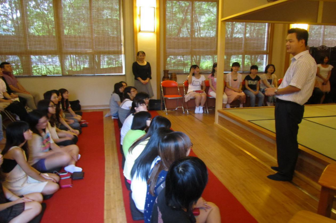 本网讯 6月1日下午,在佳乐庵茶室,日本能乐大师安田登先生用诙谐幽默的形式、通俗易懂的语言讲授了关于日本传统文化能乐的知识,并进行了别开生面的能乐表演。这是安田先生第二次到访我校。伟德bv国际体育日语系主任张秀强以及40多名日语学子参加了此次活动。茶室负责人杜凡与里千家驻穗茶道讲师村内伦子筹备了此次活动。