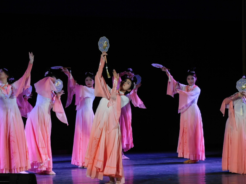 中文院舞队为大家带来了一场美如画卷的视觉盛宴。她们身着粉裙,手持团扇,在柔和的伴奏下翩翩起舞,带领观众走进诗情画意的江南水乡。