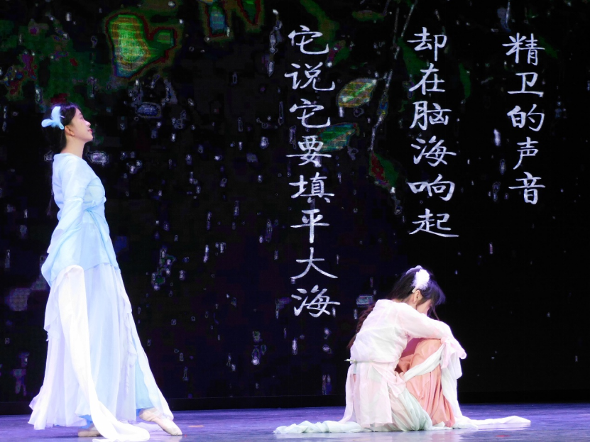 王惠琴、陈泳霖两位同学身穿古香古色的舞服,粉蓝相映,水袖纷飞,描绘出精卫填海时精卫的迷茫与挣扎、最后又能坚定内心的心路历程。