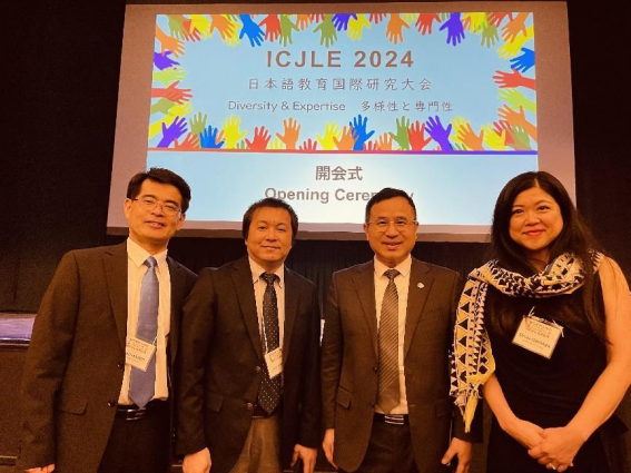 左起:韩国日本学会会长检校裕朗教授、香港日本语教育研究会会长村上仁及新加坡日语教师会代表石原悦子女士,与陈多友会长合影留念