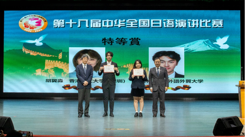 评委会主任周异夫教授、中国日语教学研究会会长陈多友教授为获奖选手颁奖