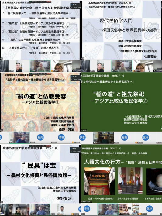 第七至九讲“亚洲比较民俗学②”于7月9日下午举行。佐野贤治教授以稻作文化的传播为切入点,探讨了佛教与农业社会祖先信仰的融合。随后,佐野教授提出“海上之路实为鳗鱼之路”的创见,并讲解了佛教与民俗的关系及佛教的日本化过程。日本农村文化研究所远藤宏三理事长也在结尾表示,期待中日加强友好交流,互学互鉴,共创美好未来。