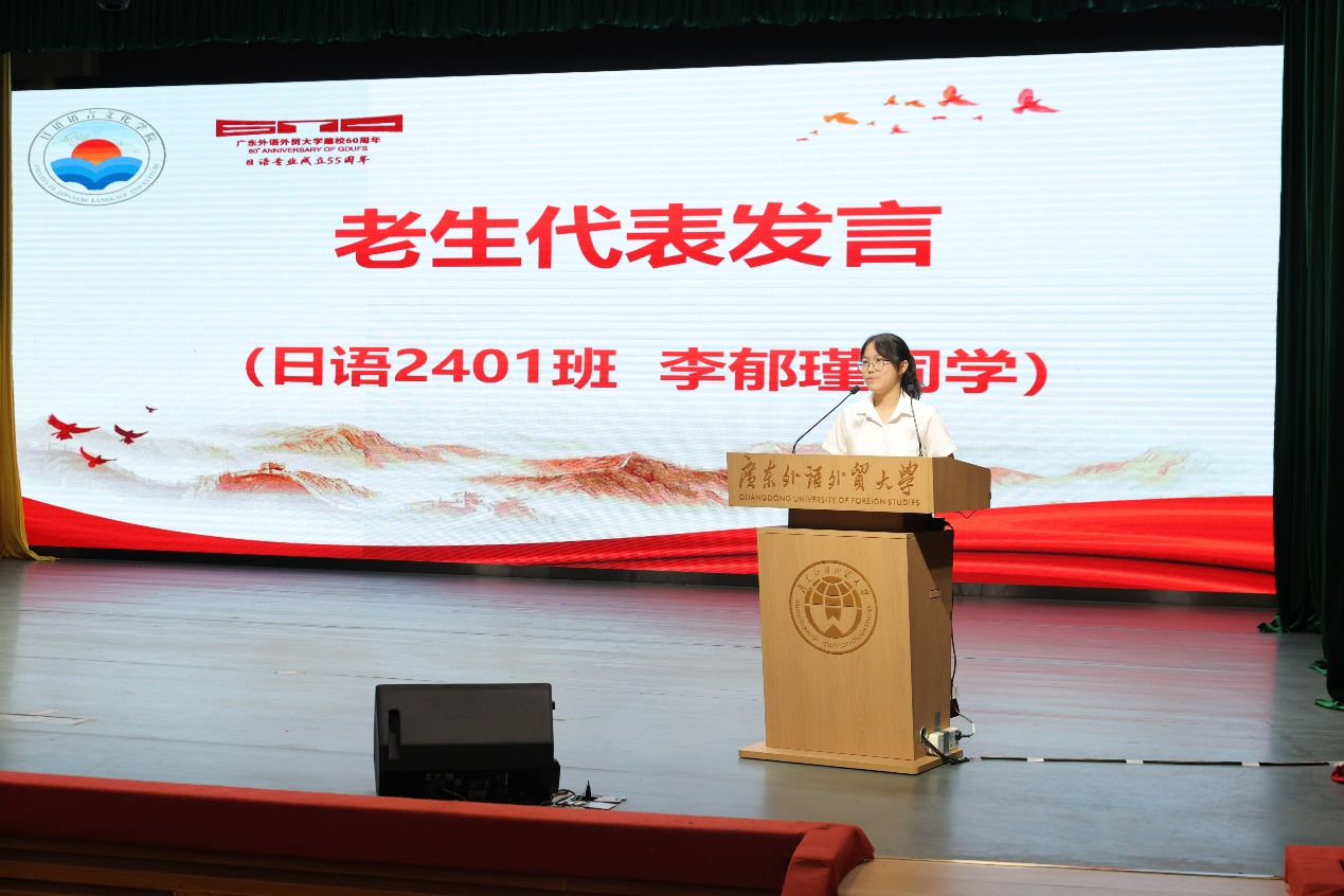 本科老生代表李郁瑾同学希望学弟学妹们勇敢尝试一切可能,在课堂中汲取智慧,在活动中开阔眼界,在交流中播种情谊。适逢广外建校60周年和广外日语专业成立55周年,在新的起点上,她希望与同学们继续携手奋进,共同谱写属于广外与日语的新辉煌。