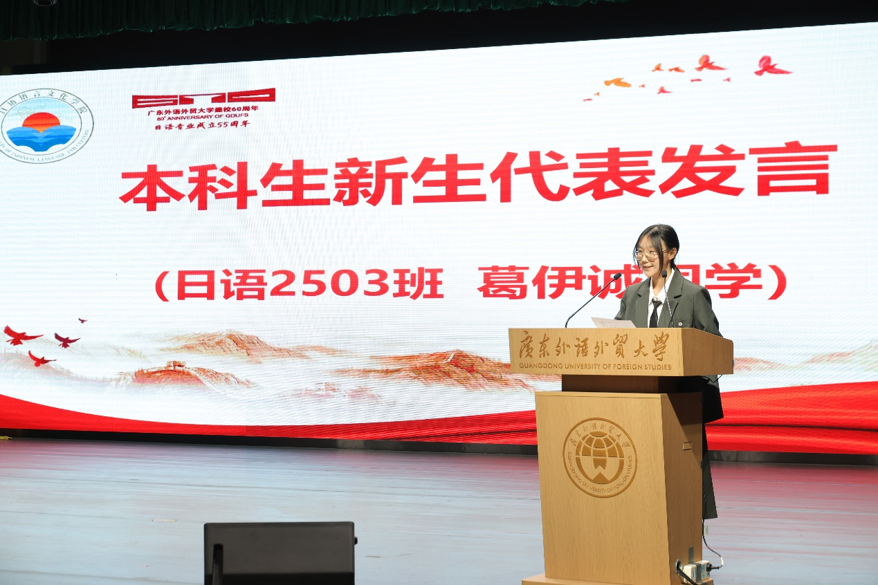 2025级本科新生代表葛伊诚回忆了那段镌刻着奋斗与成长的金色年华和通过无数个日夜的努力最终跨越高考,实现与美丽广外双向奔赴的经历。她认为站在这个承前启后、继往开来的历史节点,同学们不仅是广外辉煌历史的见证者,更是广外璀璨未来的开创者。