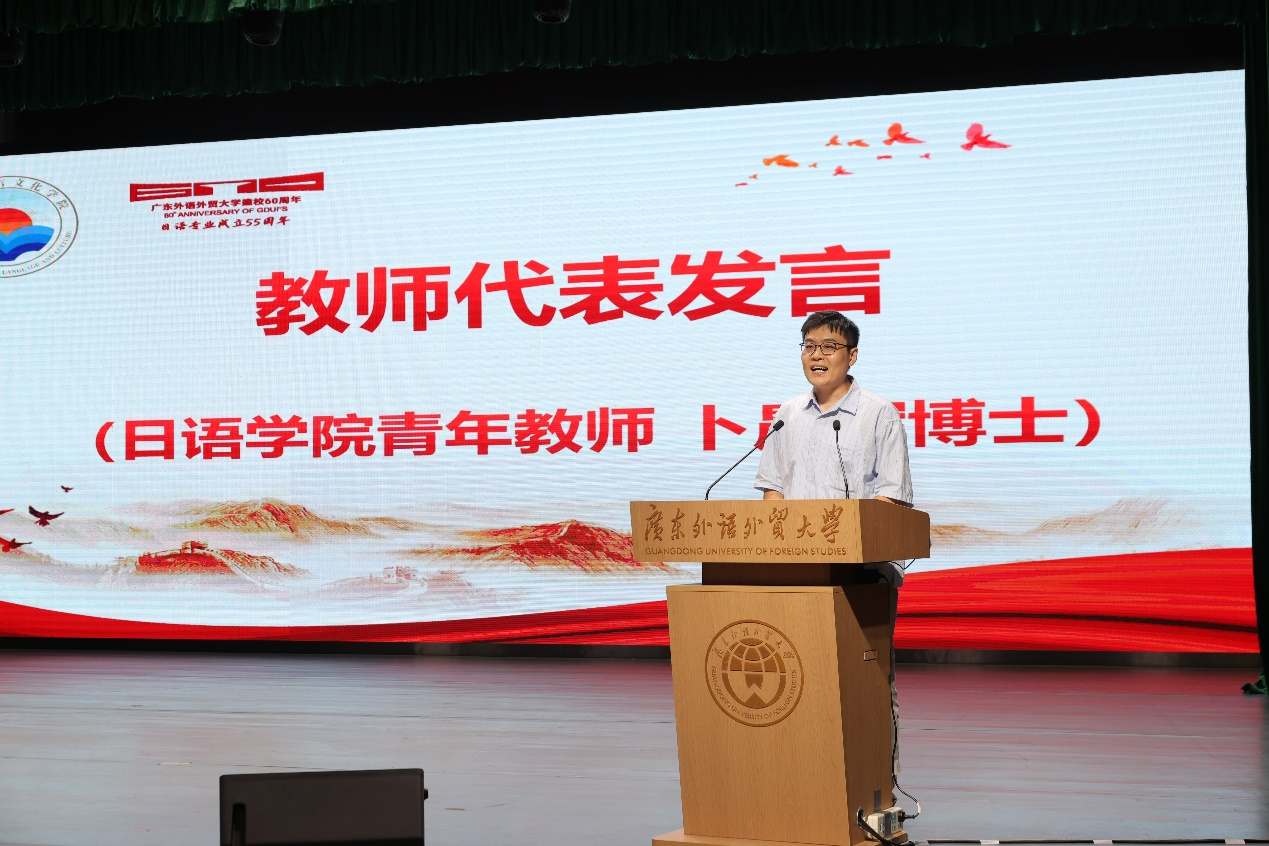 教师代表卜晨晖老师用几则小故事与新生们分享了广外日语带给同学们的蜕变与幸福。他用自己的亲身经历鼓励同学们鼓起勇气积极发言和参加学术活动,在很多的不期而遇中发现自己新的可能。希望同学们能在白云山北麓的广外找到属于自己的才情与青春激情。