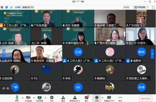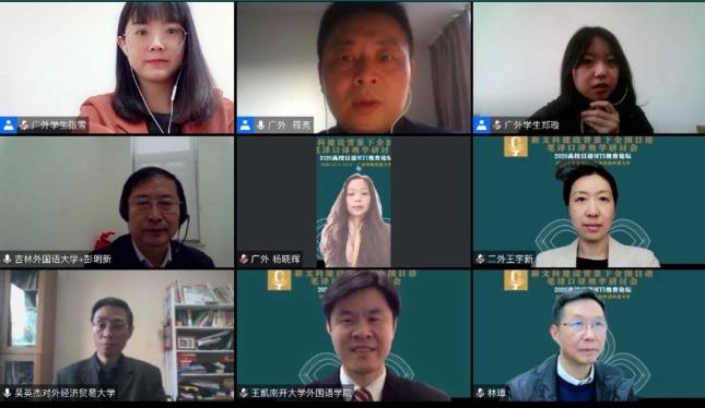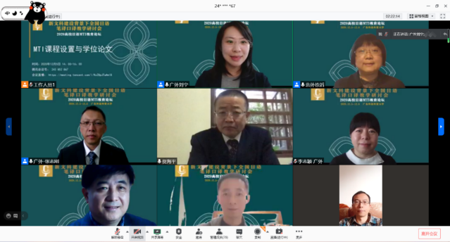 2020年12月5日,新文科建设背景下2020高校日语翻译专业建设高端论坛在我校举办。来自北京外国语大学、天津外国语大学、吉林大学、南开大学、暨南大学等国内上百家高校的近300名专家、学者及同行参加了此次论坛。本次论坛分设四个分科会,分别就MTI 教育改革与发展、MTI 人才培养质量保障体系、MTI 课程设置与学位论文以及翻译硕士教学研究展开深入研讨,四场分科会分别由宋协毅教授、丁国旗教授、林璋教授、杨晓辉教授、徐滔副教授、张志刚副教授、朱鹏霄教授、张秀强教授主持。