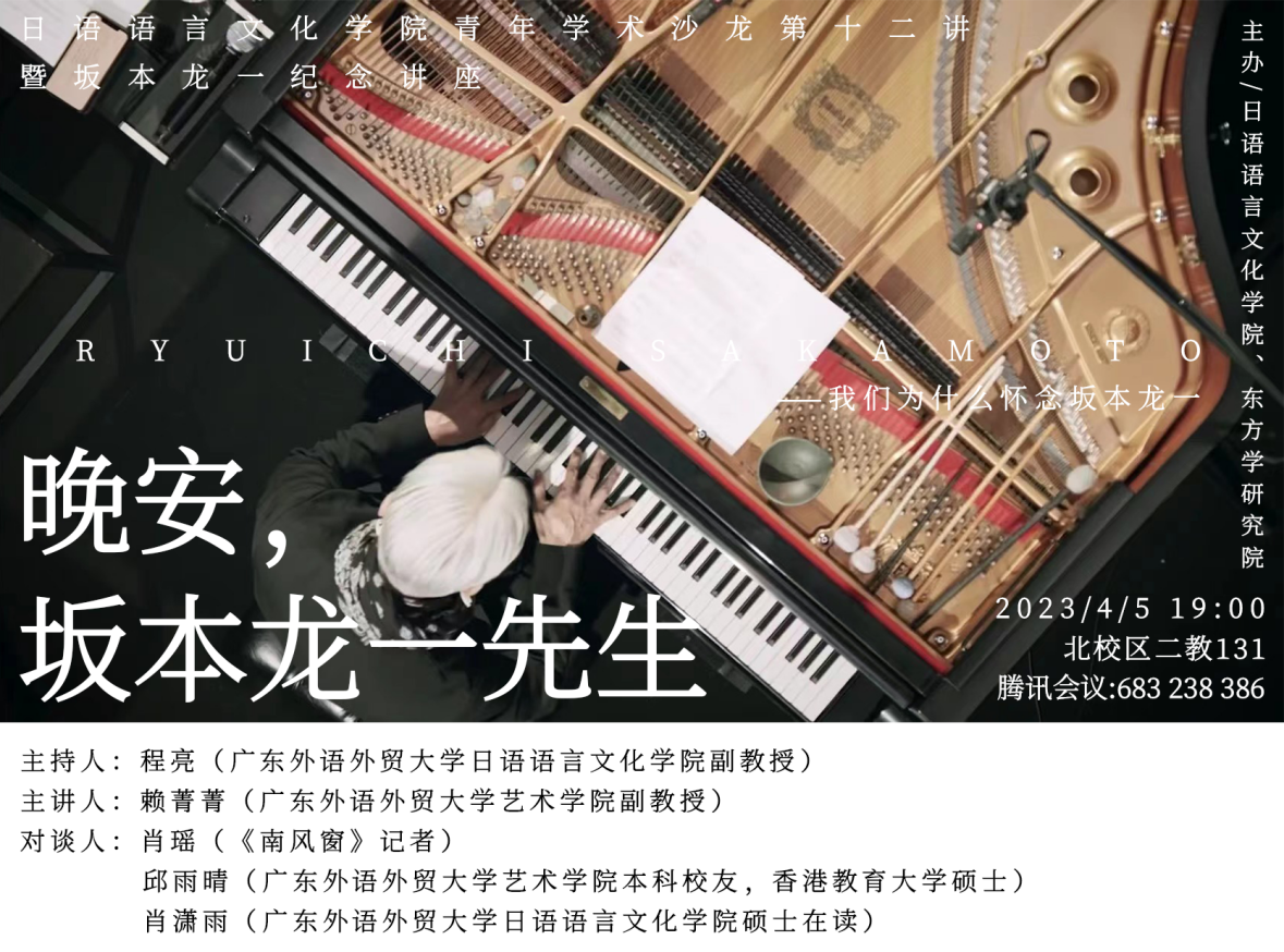4月2日,当代极具影响力的日本音乐大师坂本龙一逝世。为纪念坂本龙一先生为世界音乐及中日两国友好交流所做的贡献,日语语言文化学院、东方学研究院于4月5日主办了青年学术沙龙系列讲座第十二讲----坂本龙一纪念讲座。我校艺术学院赖菁菁副教授应邀为伟德bv国际体育师生带来题为“晚安,坂本龙一先生”的精彩分享。讲座以线上线下结合的形式开展,伟德bv国际体育程亮副院长主持,《南风窗》记者肖瑶(线上)、我校艺术学院校友邱雨晴、伟德bv国际体育研究生肖潇雨同学参与对谈讨论,共吸引我校60余名师生参与。