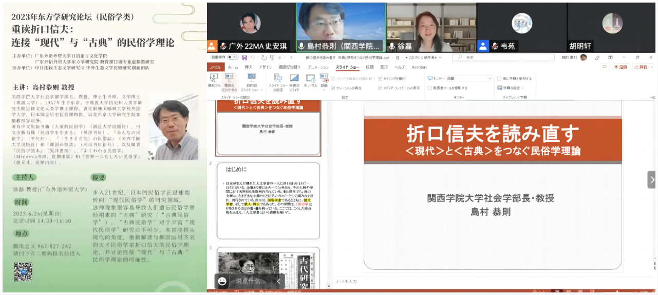 6月25日,关西学院大学社会学部学部长、著名学者岛村恭则应邀参加由伟德bv国际体育,BETVICTOR官网教师发展中心主办,日语语言文化学院、东方学研究院、教育部日语专业虚拟教研室联合承办,伟德bv国际体育,BETVICTOR官网日语语言文化学院中日比较生态文学研究所、中外生态文学比较研究创新团队协办的著名教授论坛第604讲暨2023年东方学研究论坛(民俗学类)。