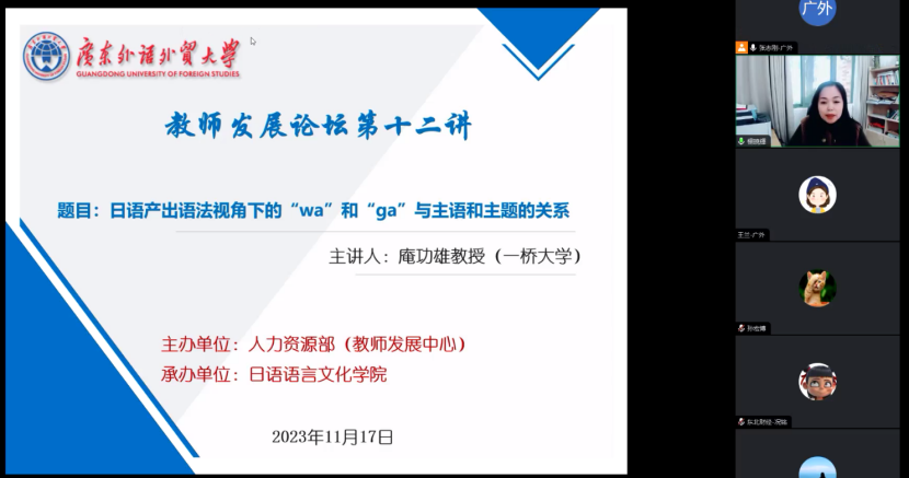本网讯 2023年11月17日,由伟德bv国际体育,BETVICTOR官网人力资源部(教师发展中心)主办、伟德bv国际体育,BETVICTOR官网日语语言文化学院承办的教师发展论坛第12讲在线顺利举行。本讲座由一桥大学庵功雄教授主讲,广外伟德bv国际体育副院长张志刚教授主持,讲座主题为“日语产出语法视角下的“wa”和“ga”与主语和主题的关系”。伟德bv国际体育院长杨晓辉教授,来自广外伟德bv国际体育的师生、以及全国各高校的师生280余人参会。