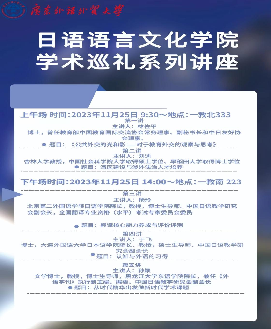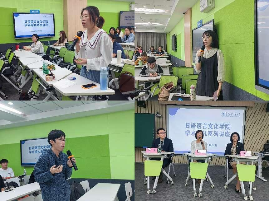 曾任教育部中国教育国际交流协会常务理事、副秘书长的林佐平教授是一名曾长期活跃在公共外交一线的工作者,他结合自身丰富的外交经历,以大量的外交案例及对外文化交流活动照片,向同学们生动地讲述了公共外交的真实情况;来自日本杏林大学的刘迪教授,从个人求学经历讲到粤港澳大湾区的发展,并鼓励日语学子多读书、拓展眼界,做一个被时代需要的综合素质高的人才。