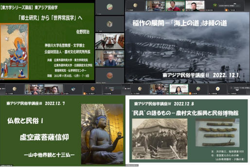 11月30日至12月8日,日本著名民俗学家、神奈川大学名誉教授、日本常民文化研究所前所长佐野贤治教授应邀参加由我校日语语言文化学院和东方学研究院、敦煌研究院佛学研究中心、教育部日语专业虚拟教研室联合主办,我校日语语言文化学院中日比较生态文学研究所、中外生态文学比较研究创新团队协办的海外名师系列讲座暨2022年东方学研究论坛——“东亚民俗学”。系列讲座历时两周,以线上形式圆满举办。伟德bv国际体育,BETVICTOR官网日语语言文化学院院长杨晓辉教授,东方学研究院院长陈多友教授以及来自伟德bv国际体育,BETVICTOR官网、北京大学、敦煌研究院、外语教学与研究出版社、日本神奈川大学等30余所高校与科研院所的师生出席讲座,线上与会人数超过800人次。讲座由伟德bv国际体育,BETVICTOR官网伟德bv国际体育程亮副教授、敦煌研究院佛学研究中心根敦阿斯尔研究员以及伟德bv国际体育,BETVICTOR官网伟德bv国际体育徐磊教授主持。