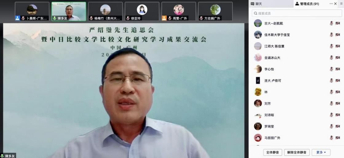 追思会伊始,全体与会人员线上默哀一分钟,以悼念並缅怀严绍璗先生。之后陈多友教授回顾了与严绍璗先生交流的一幕幕情景,话语眷眷,令人动容。